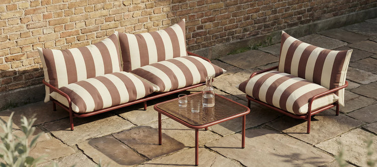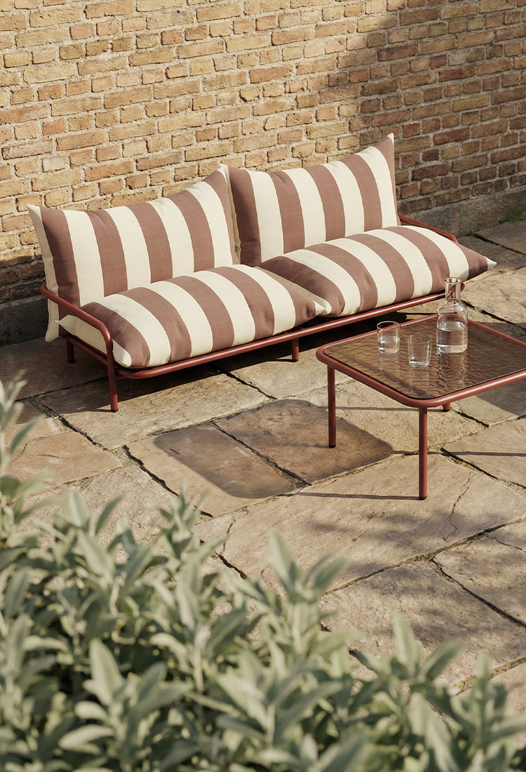 Utendørs sofabord fra SACKit i pulverlakkert aluminium og herdet glass.