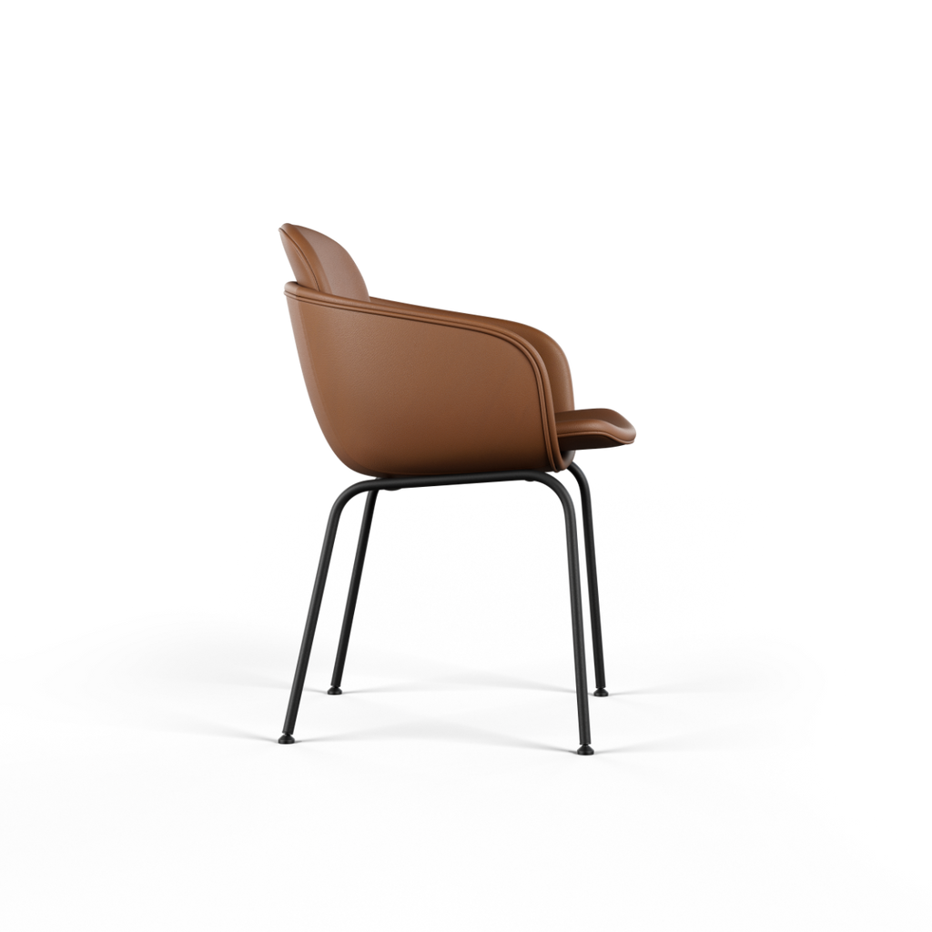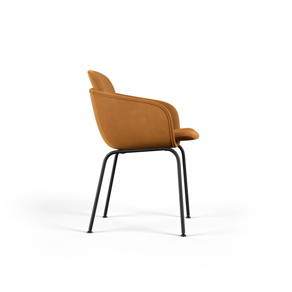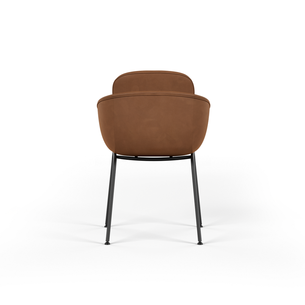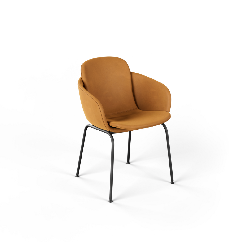 Chair no. One er en spisestol med kompromissløs design laget av nøye utvalgte materialer med fokus på bærekraft og kvalitet. Rammen er laget av pulverlakkert resirkulert stål, mens setet er laget av resirkulert plast og trukket med SPOOR-lær av høyeste kvalitet.