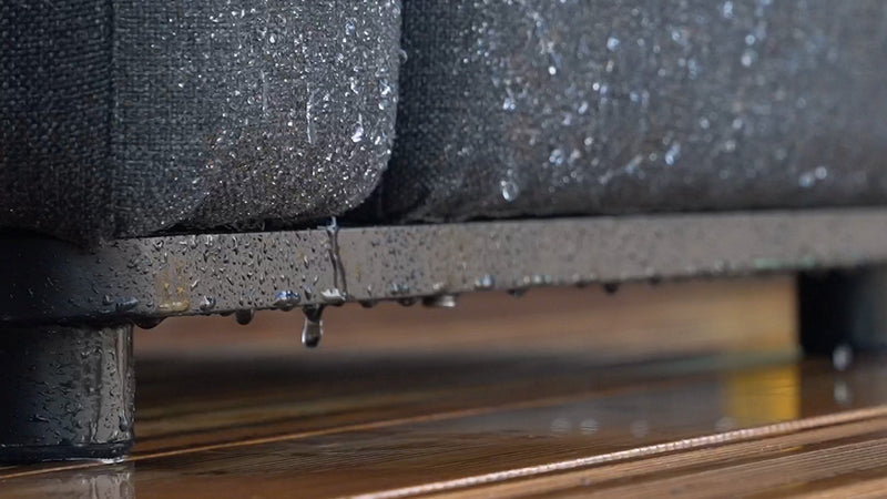 Ja det gjør den. Stoffet er laget i 100% syntetisk olefin som ikke blir muggent ved fukt. Det hurtigtørkende skummet (Quick Dry Foam) i sofaen sikrer at den tørker raskt igjen.