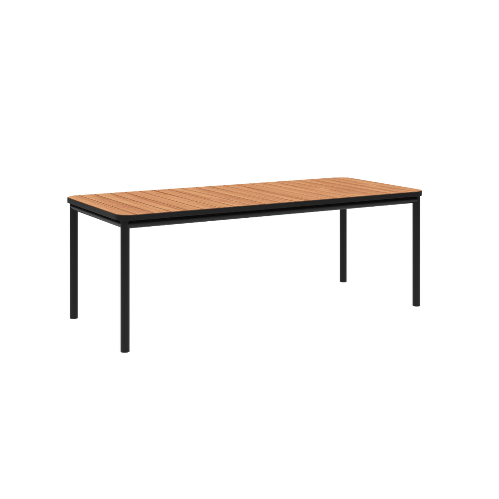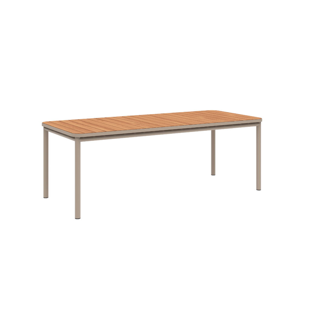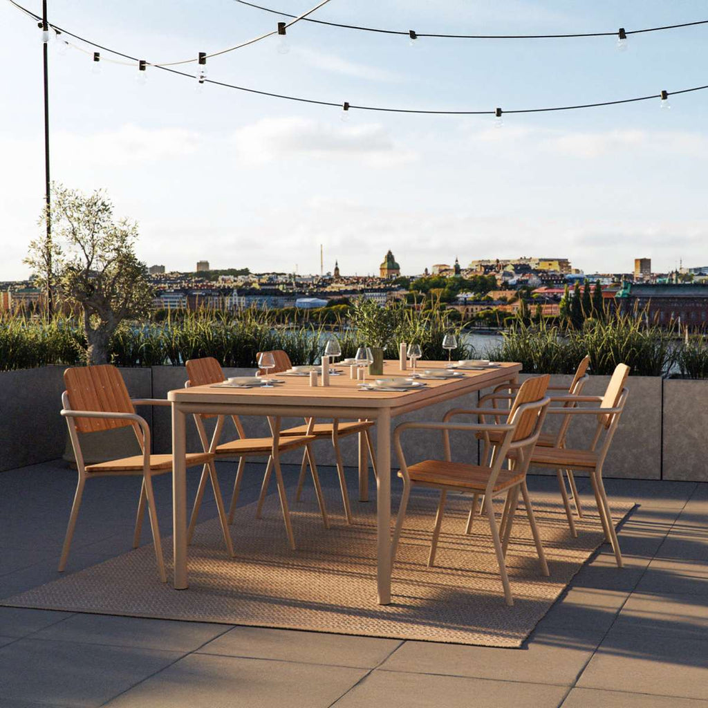 Kirra Dining Table er et spisebord for utendørs bruk i pulverlakkert aluminium og FSC®-sertifisert teak (FSC® C190311). Aluminiumet gjør bordet lett og rustbestandig, mens teaken tilfører varme og en naturlig patina over tid.