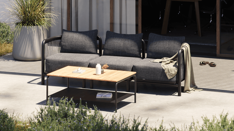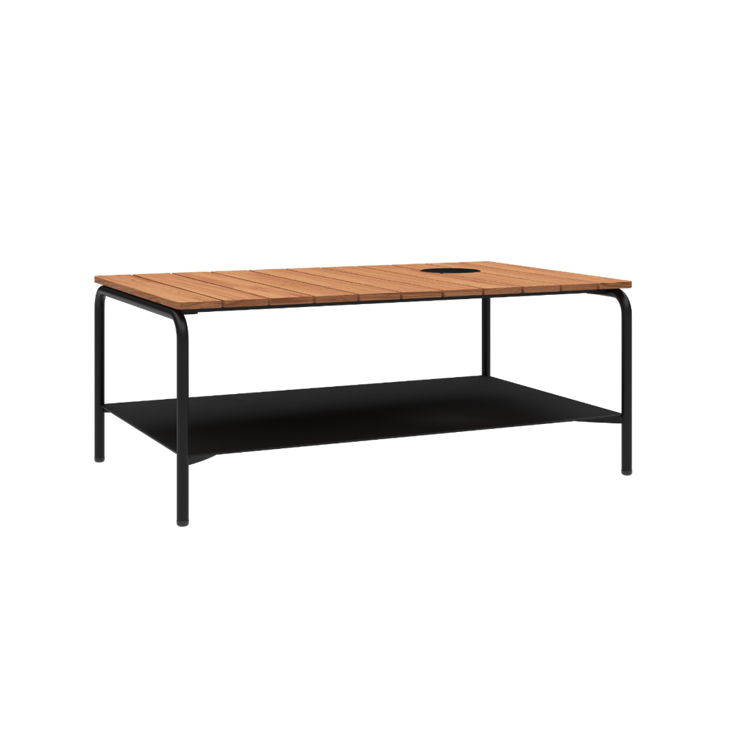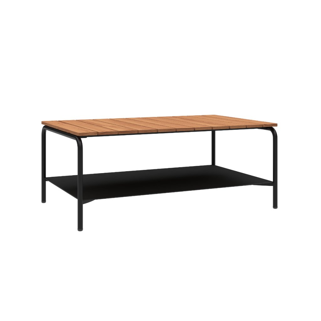 Patio Coffee Table er et stilig og funksjonelt utesofabord laget av pulverlakkert aluminium og en bordplate i FSC®-sertifisert teak (FSC® C190311). Aluminium gjør bordet lett og rustbestandig, mens teak gir det varme og en naturlig patina over tid. Bordet er ideelt som et supplement til utesofaserien vår, men kan også brukes som midtpunkt for koselige stunder utendørs.